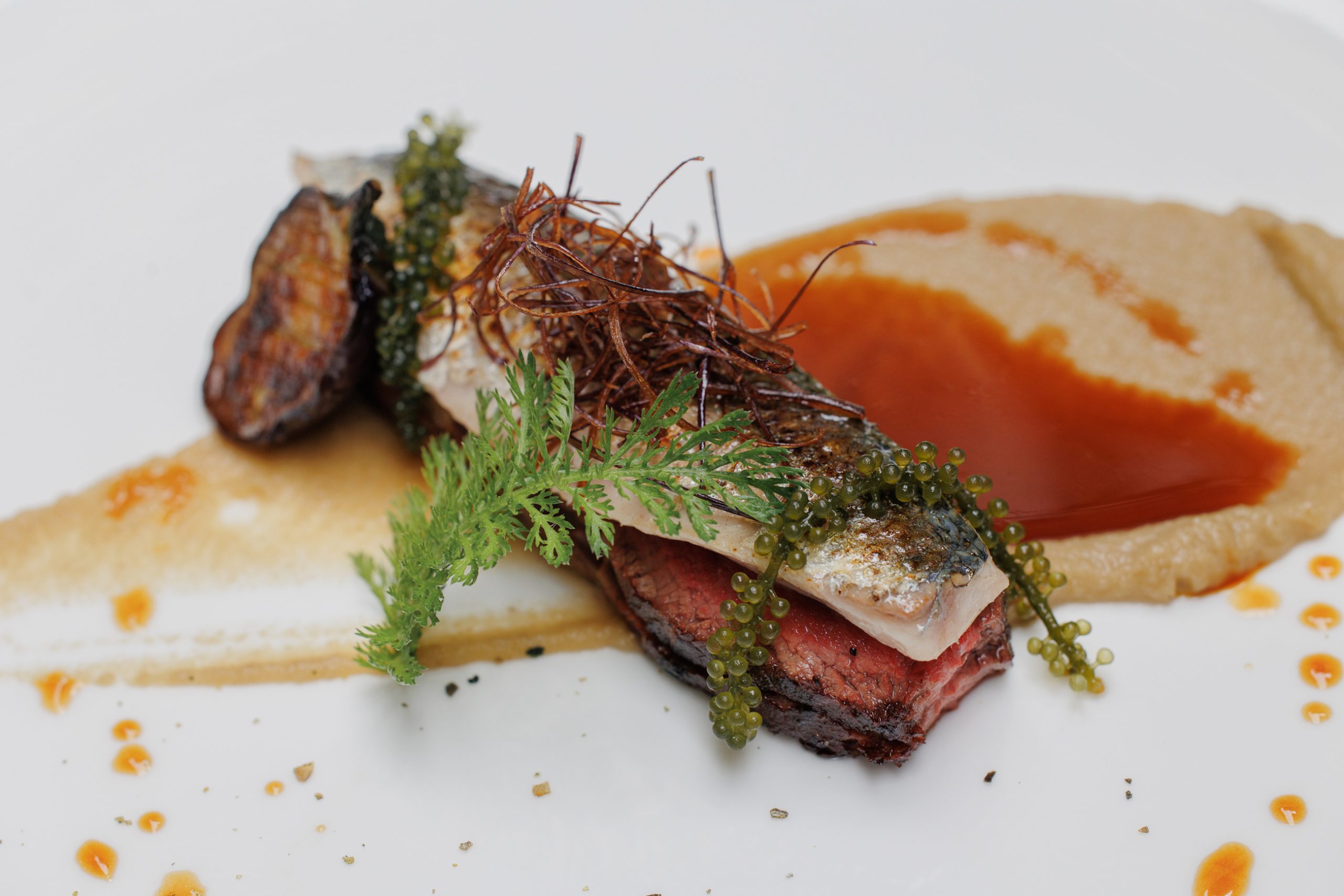 - Maquereau de nos côtes, jeunes navets en gelée marine, condiment de fanes