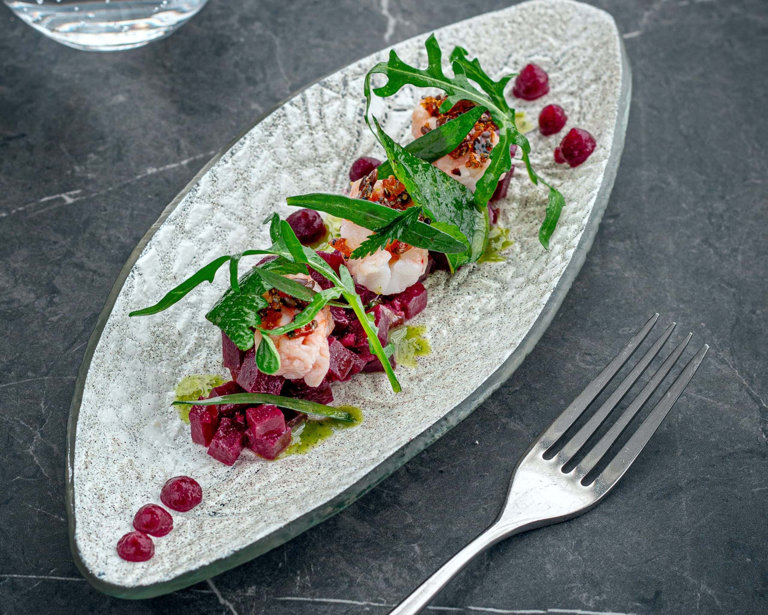 - Tomate déclinée, huile et graines de cameline, flétan fumé, fleurs du jardin